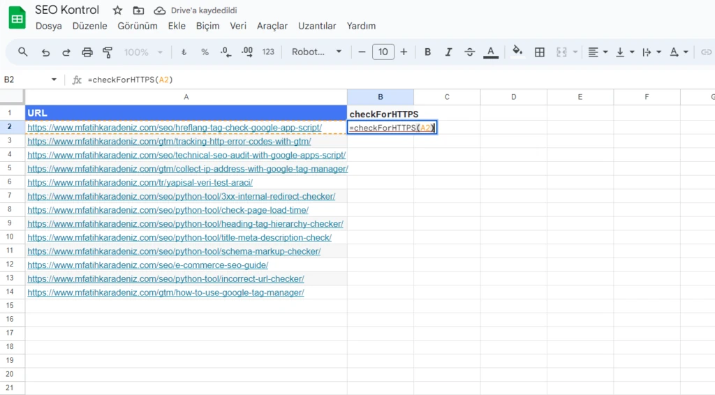 Tekrar E-tablomuza dönerek kodu test edelim. Bunun için görseldeki gibi kod üzerinde checkForHTTPS adı ile eklediğimiz fonksiyon için bu formülü kullanalım: =checkForHTTPS(A2)