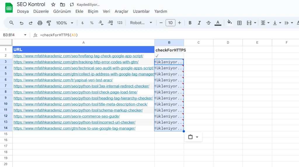 Bu şekilde A2'de yer alan URL'lerin HTTPS ile başlayıp başlamadığını kontrol edebileceğiz. Aynı şekilde diğer URL'leri de kontrol edebilmek için B2'de eklediğimiz formülü aşağı sütunlar için de kopyalayalım.