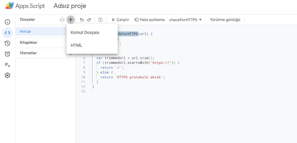 Aynı şekilde Kırık Link tespiti yapmak için de Apps Script üzerinden bu kodu ekleyelim. Bunun için yine yukarıda Uzantılar kısmından Apps Komut Dosyasına gelelim. Yeni bir kod eklemek için '+' işaretine tıklayıp Komut Dosyasını seçerek yeni bir komut dosyası ekleyebiliriz.