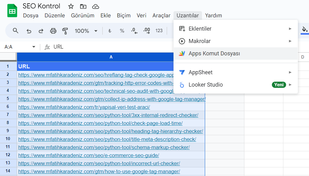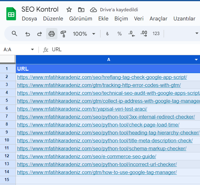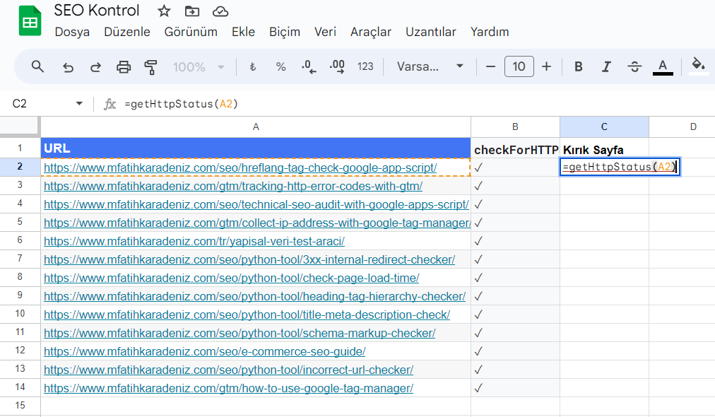 Aynı şekilde aşağıda yer alan linklerden diğer SEO hatalarını kontrol etmenizi sağlayacak kodlara ulaşabilirsiniz. Eklemek istediğiniz kodları ekleyin ve kaydedin ve daha sonra aynı şekilde formül kısmını girerek A sütununa ekleyeceğiniz